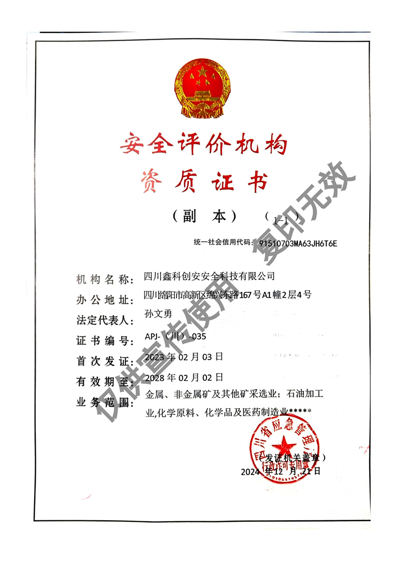 四川鑫科創(chuàng)安安全科技有限公司成立于2020年,是川北地區(qū)取得資質(zhì)的民營(yíng)安全評(píng)價(jià)機(jī)構(gòu)(資質(zhì)證書(shū)編號(hào):APJ-(川)-035)。并于2022年?duì)款^成立綜合應(yīng)急救援隊(duì)伍 - 綿陽(yáng)曙光應(yīng)急救援中心。
